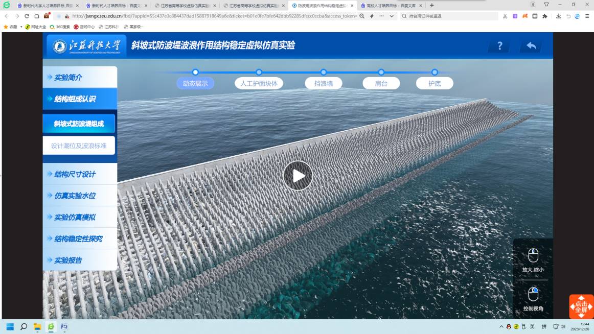 由周效国团队倾力打造的《斜坡式防波堤波浪作用结构稳定虚拟仿真实验教学案例》,借助虚拟现实、仿真装备、人机交互技术,开发了斜坡式防波堤波浪作用结构稳定虚拟仿真实验系统,进行防波堤构造及与波浪作用的情境体验、基础认知和关键程序的交互操作,使真实防波堤构造与防波堤波浪作用难以实施的实验教学活动通过虚拟仿真教学方式得以顺利实现。